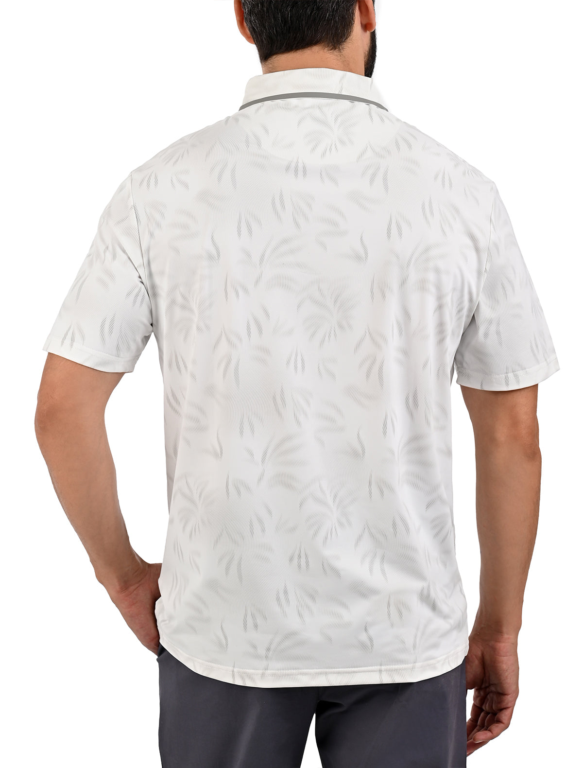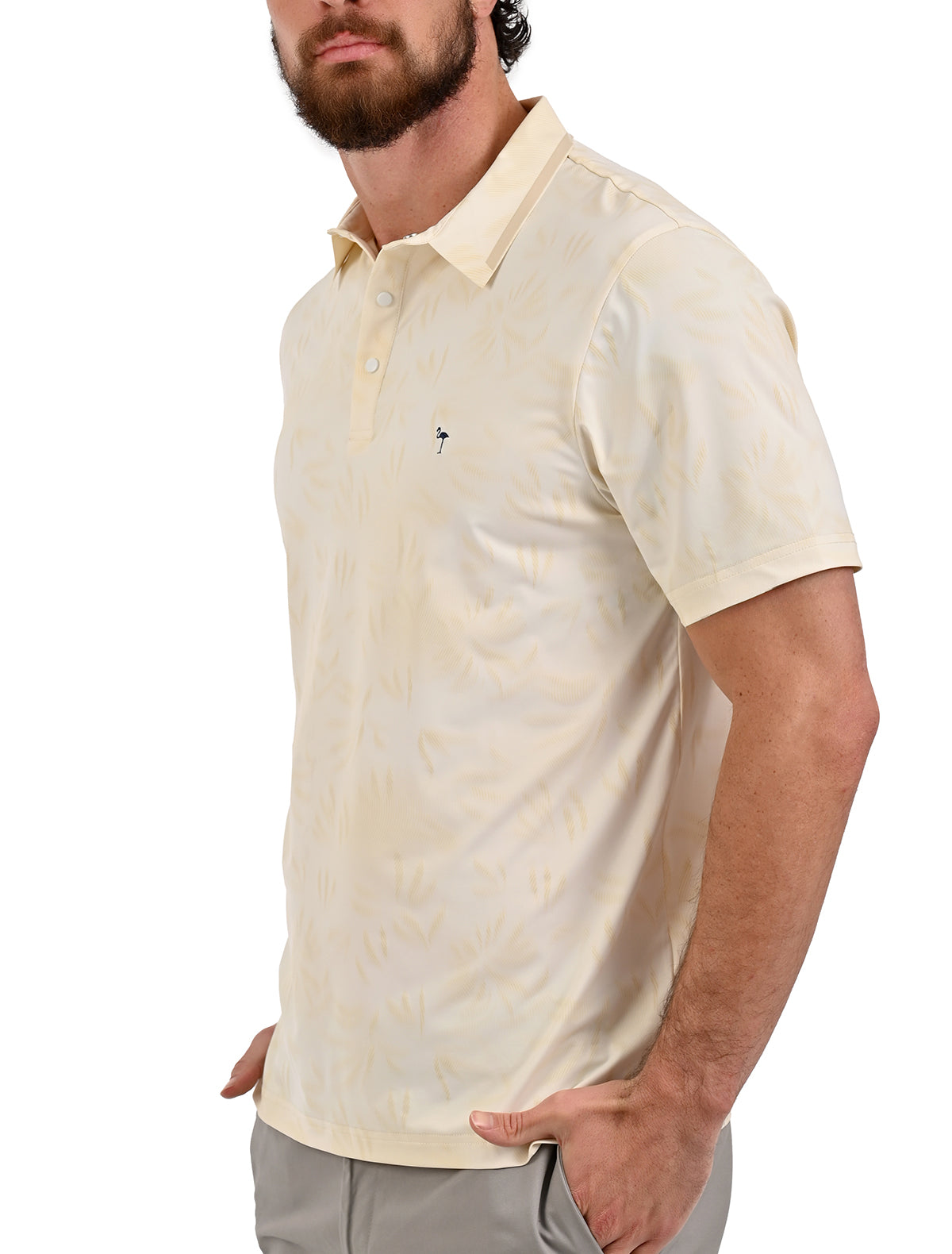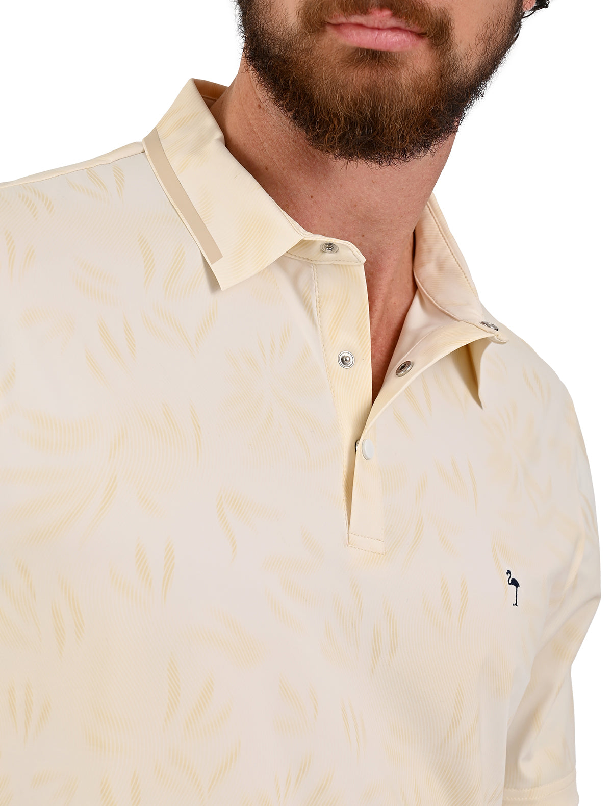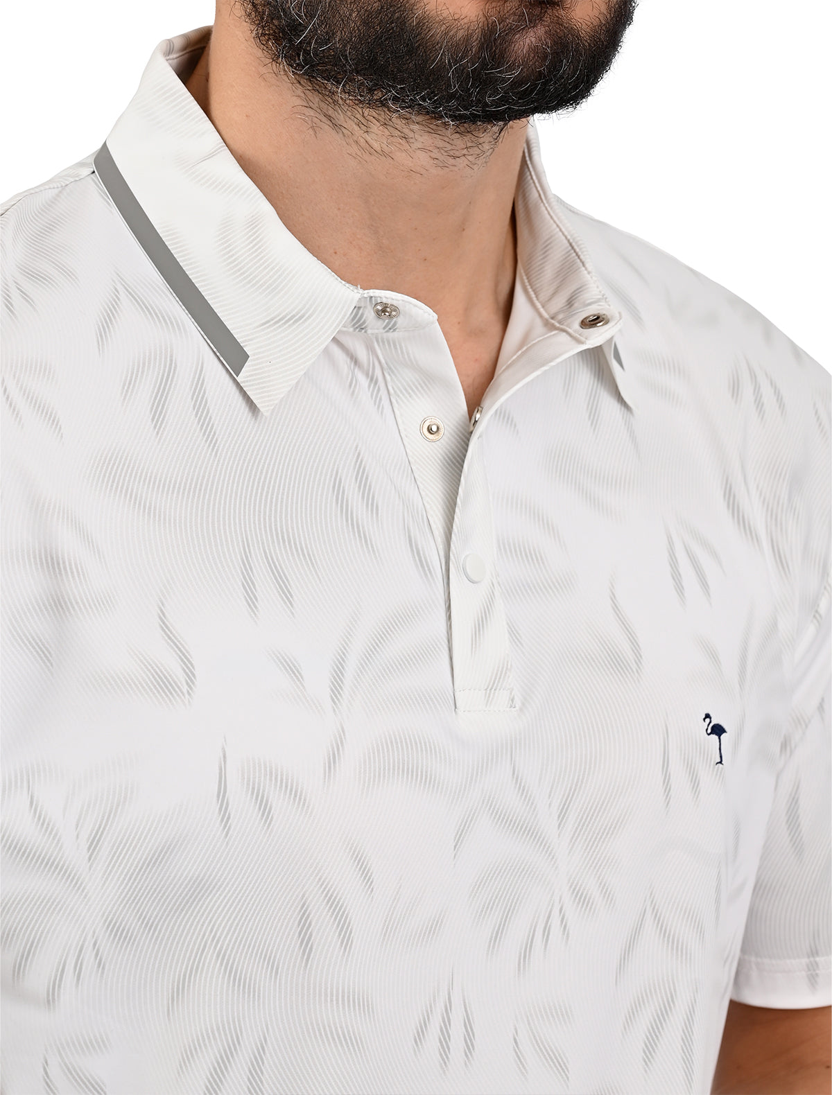- Diseño jacquard sutil y sofisticado: patrón tonal en toda la prenda con cuello polo clásico, botones metálicos y logo de flamingo bordado en el pecho.